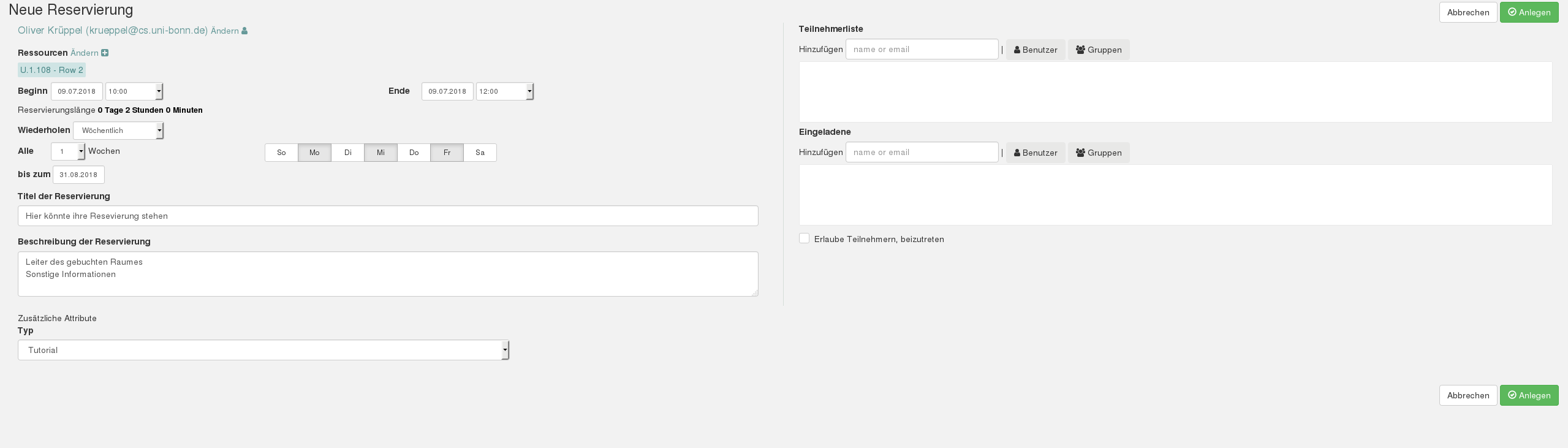 Um Räume wiederholent zu buchen wählen Sie unter „Wiederholen“ „Wöchentlich“ aus.