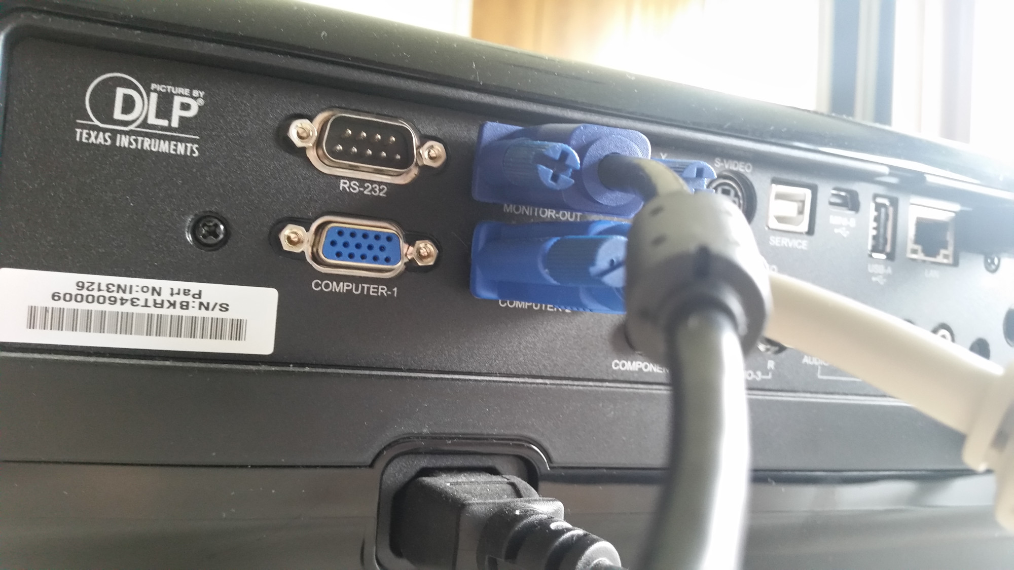 Verbinden sie den VGA Stecker des VGA zu DVI Kabels mit dem Videoausgang des Beamers. Diese Buchse ist zumeist mit „Monitor-Out“ beschriftet.