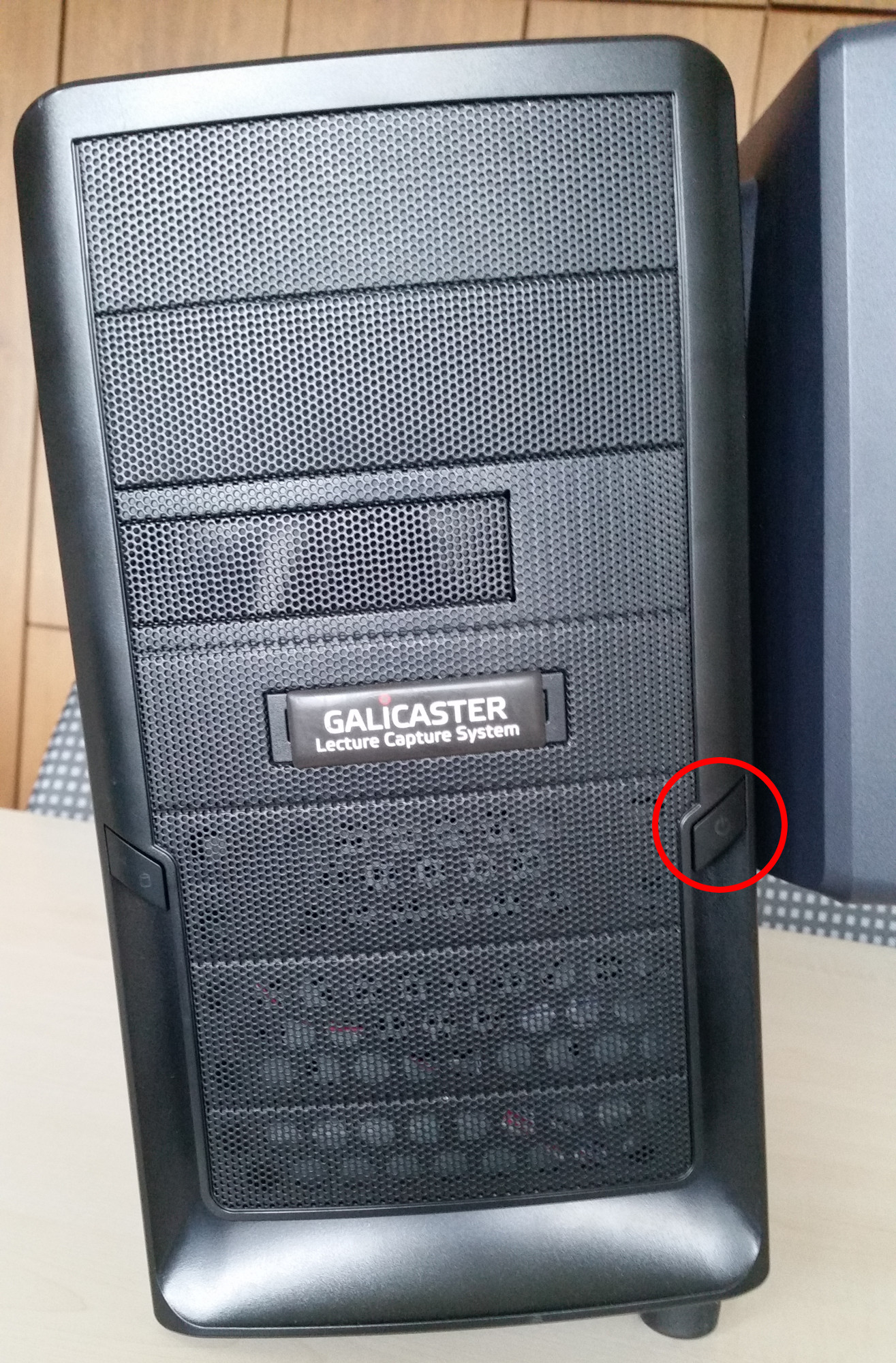 Der Galicaster sollte automatisch hochfahren, falls nicht, vergewissern sie sich, dass der Netzteilschalter an der Rückseite auf 1 (eins) steht und drücken sie den Ein/Ausschalter an der Vorderseite des Geräts.