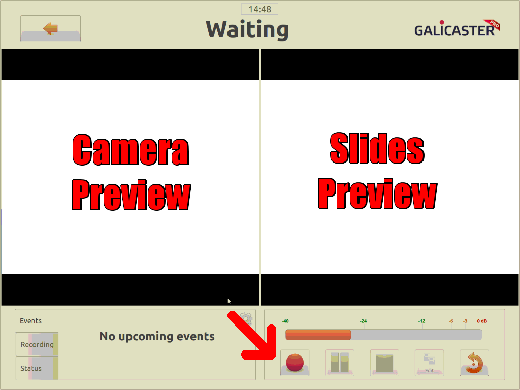 Sobald der Galicaster hochgefahren ist, können sie den Touchscreen benutzen um die Aufzeichnung ihrer Vorlesung zu starten und zu beenden. Berühren sie hierzu die Schaltfläche mit der Aufschrift „Recorder“, dann berühren sie die Taste „Record“.