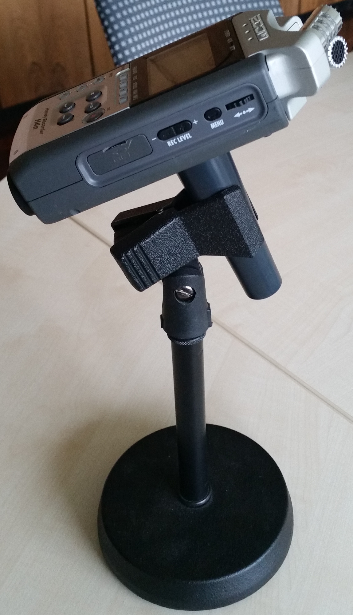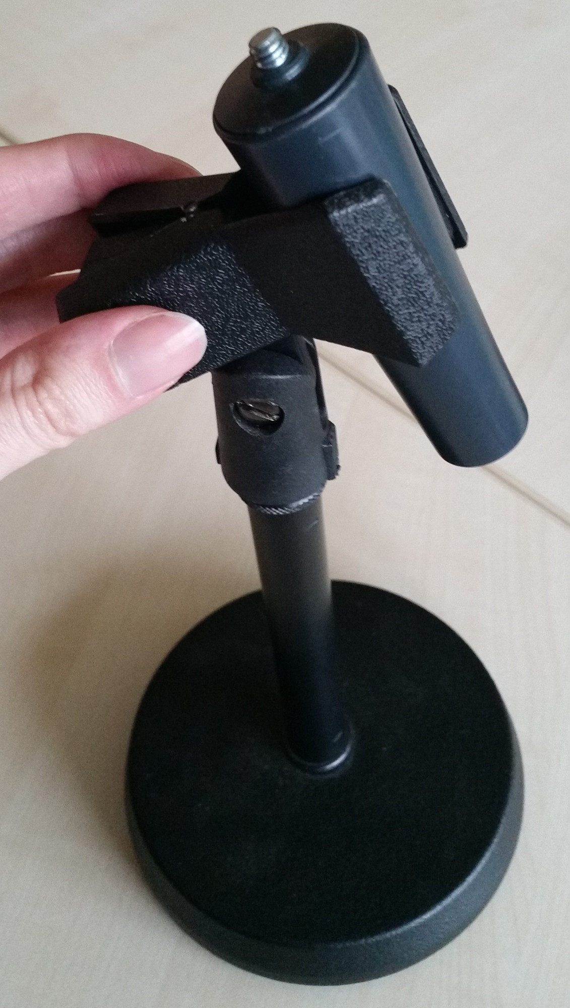Um den Ständer mit dem Mikrophon zu verbinden, entnehmen sie die runde Ständer-Komponente aus der Zwinge und drehen sie diese an der Rückseite des Mikrophons fest, bevor sie sie wieder in der Zwinge fixieren.